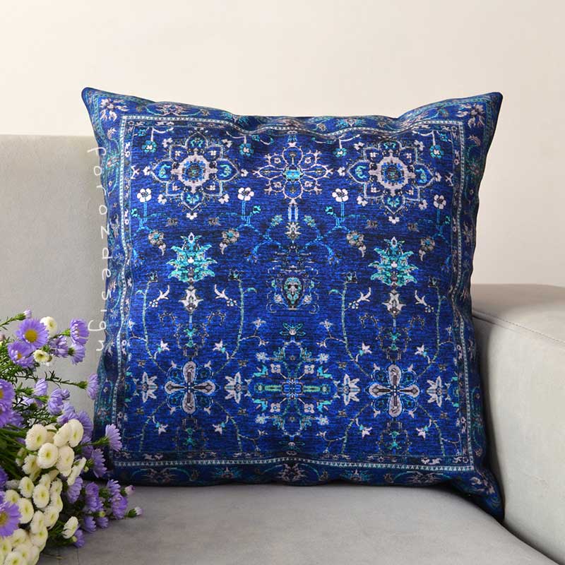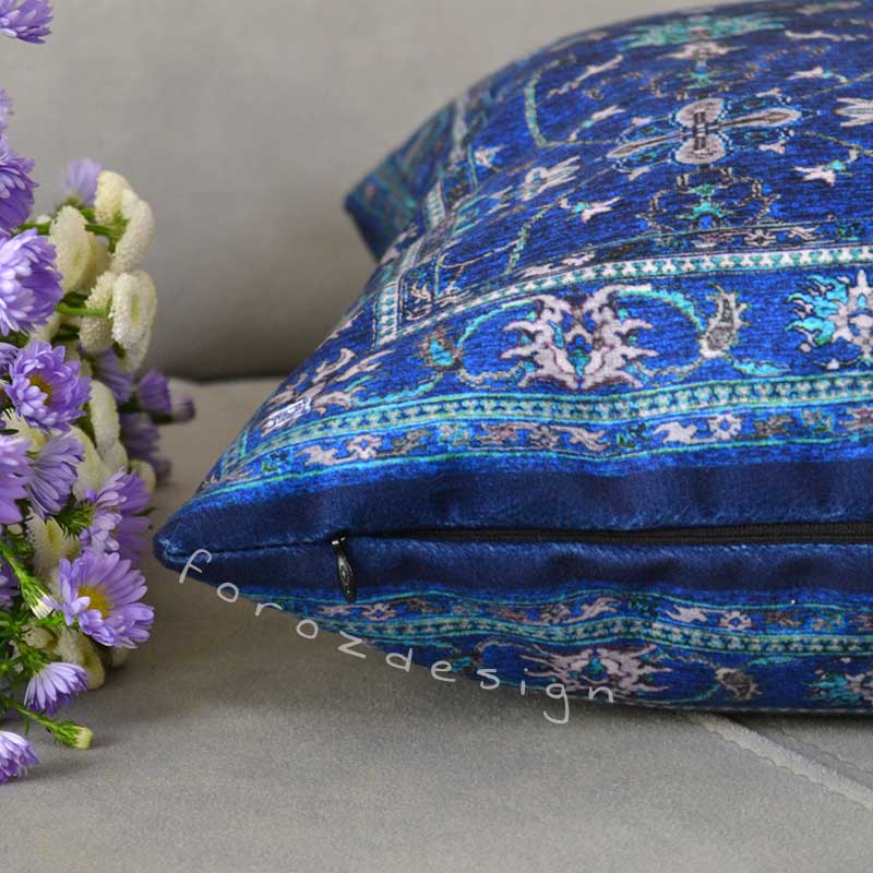 کاور کوسن دورو چاپ با طرح شباهنگ (زمینه آبی تیره با گلهای خاکستری و فیروزه ای)